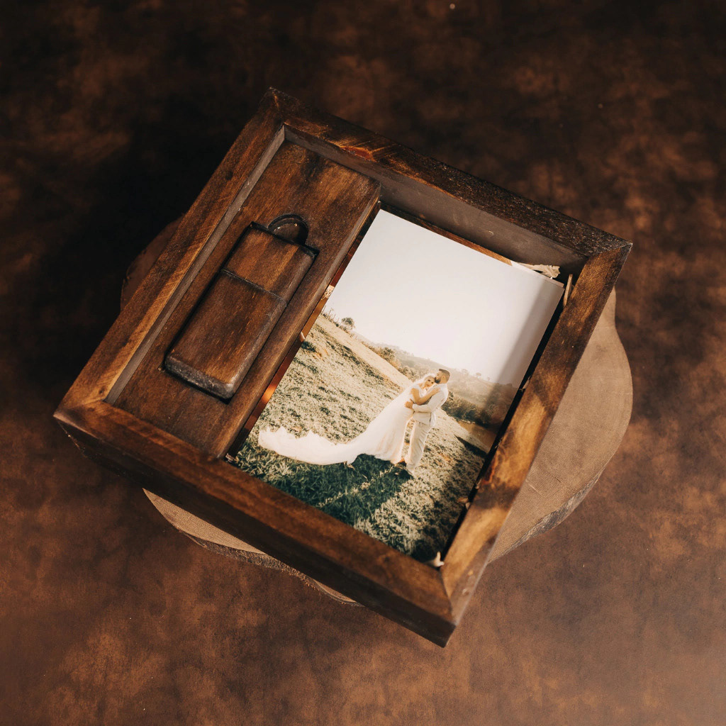 Caixinha de madeira de Pinus (madeira de reflorestamento tratada) com tampa de encaixe. Possui um compartimento para o Pen Drive (Pen Drive em Peroba rosa.) e fotos 10x15 cm.